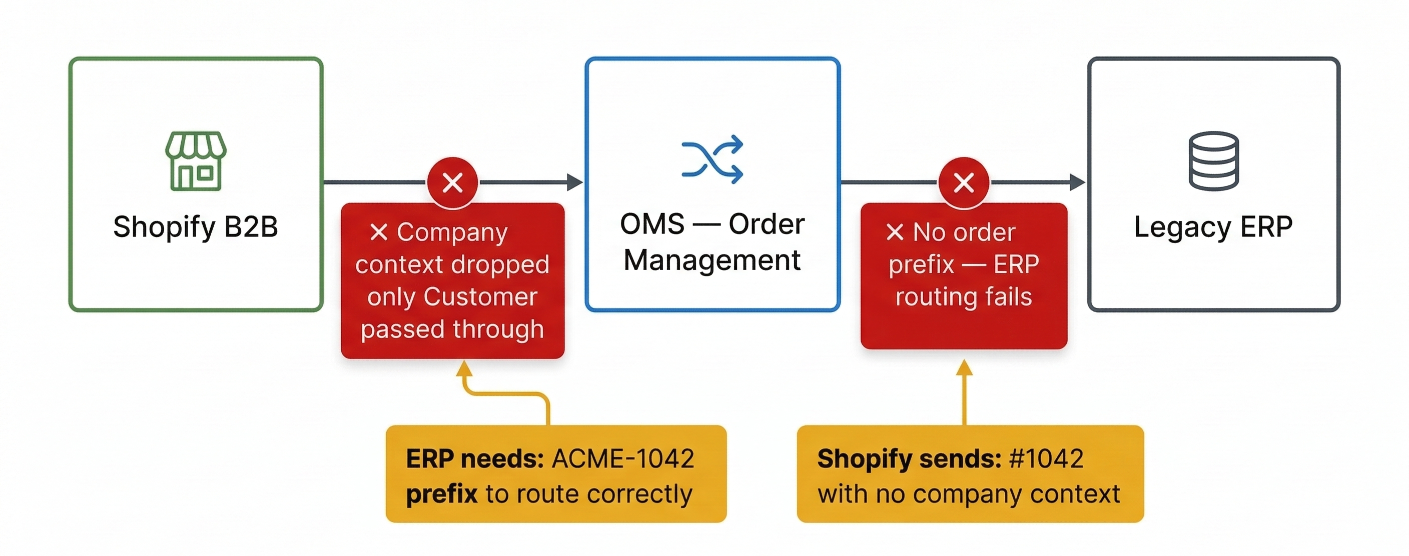 The standard Shopify → OMS connector passed only the customer object. The company context was silently dropped.