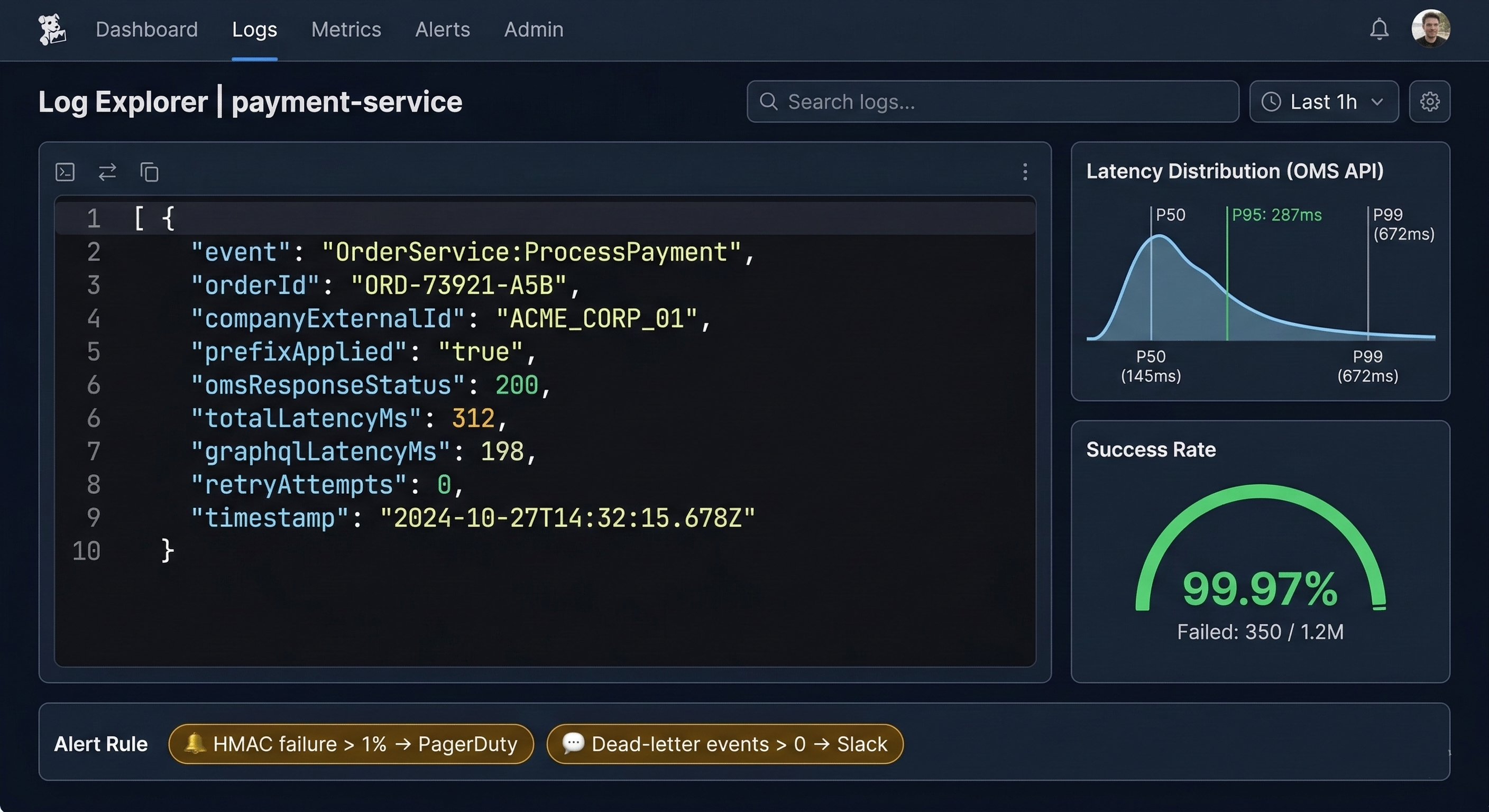 | OMS forward success rate | > 99.9% | < 99% over 15 min |
