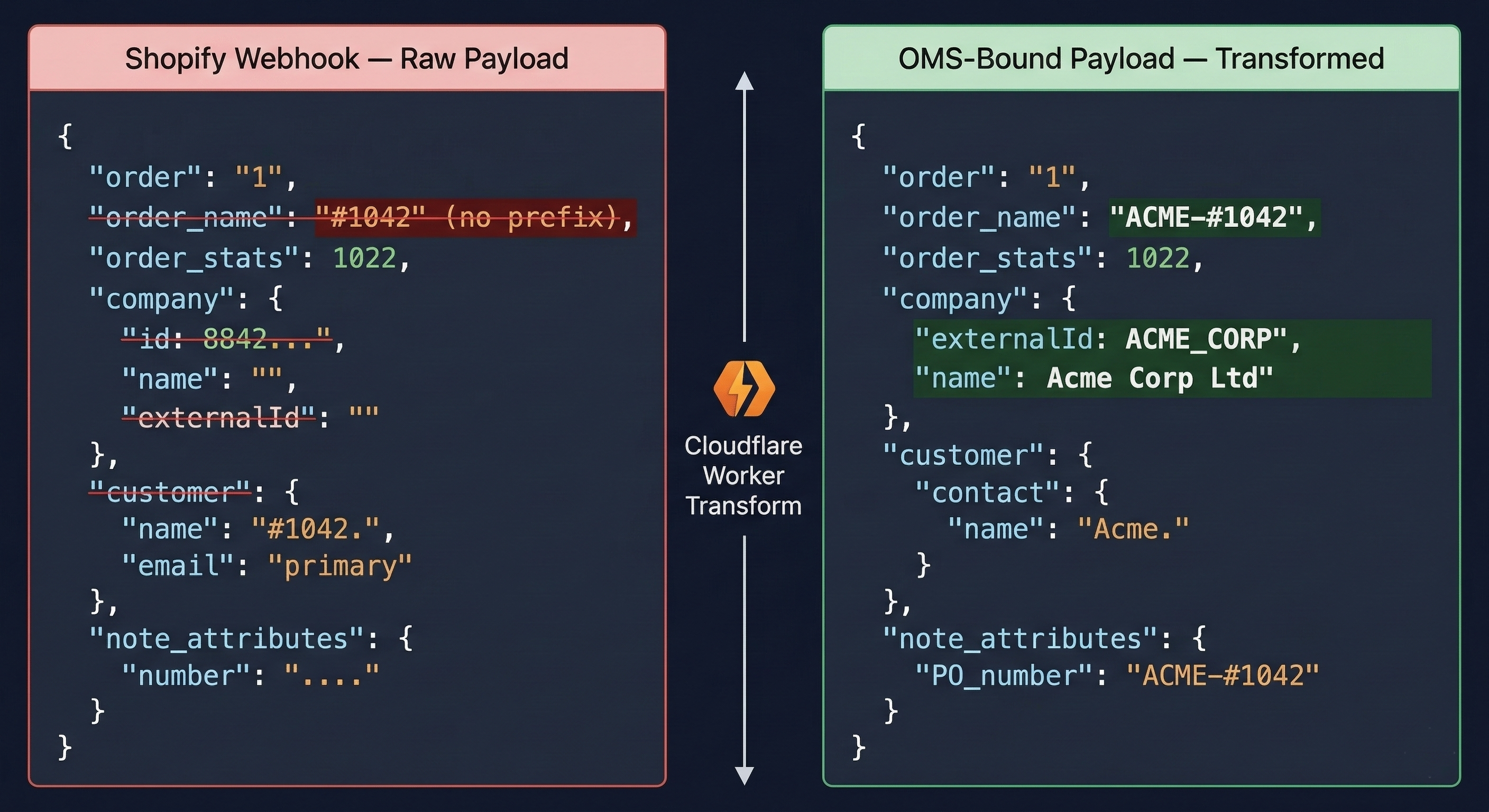 The company’s externalId maps to the correct ERP prefix. order.name and order_number are rewritten. Company identity is remapped to the field the OMS routes by. PO number is injected into note_attributes.