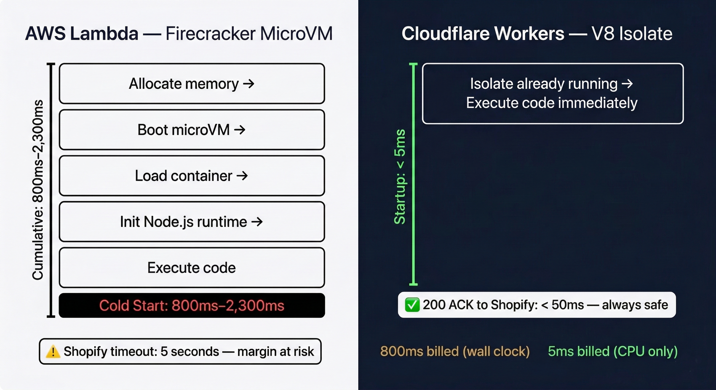 AWS Lambda runs on Firecracker microVMs. Cold starts range from 800ms to over 2,300ms — a dangerous fraction of that five-second window, leaving almost no margin for HMAC verification, a GraphQL call, and payload transformation.
